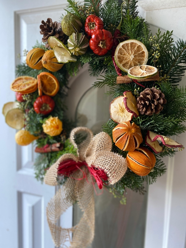 Made using seasonal foliage and decorated with pinecones, Orange/lemon/lime balls, dried oranges, cinnamon sticks and coordinating ribbon.