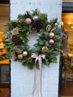 Our handmade Rose gold wreath is the perfect Christmas decoration to welcome your guests. Made using seasonal foliage and decorated with pinecones, , baubles, co coordinating accessories and co coordinating ribbon.