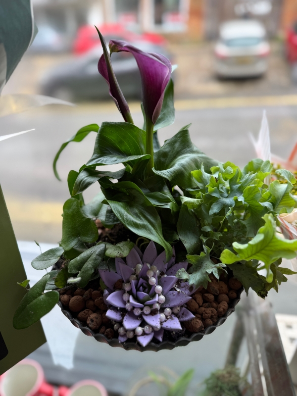 A lovely melamine planter filled to the brim with Calla, Ferns and Succulents.
